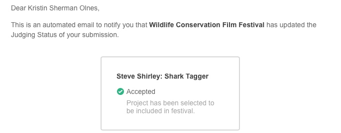 Steve Shirley and I really wanted my film to get into the San Francisco International Ocean festival, and neither of us were sure if I would. I called him immediately and told him the good news.